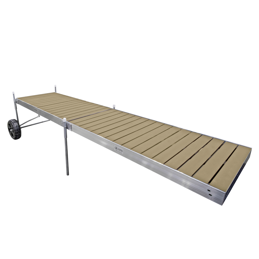 - Comprehensive Components: Includes aluminum frames with tan composite decking, heavy-duty brackets, footpads, dock pipes, safety caps, and a roll-in-dock kit.